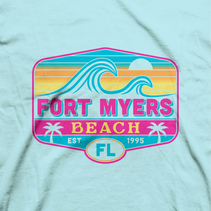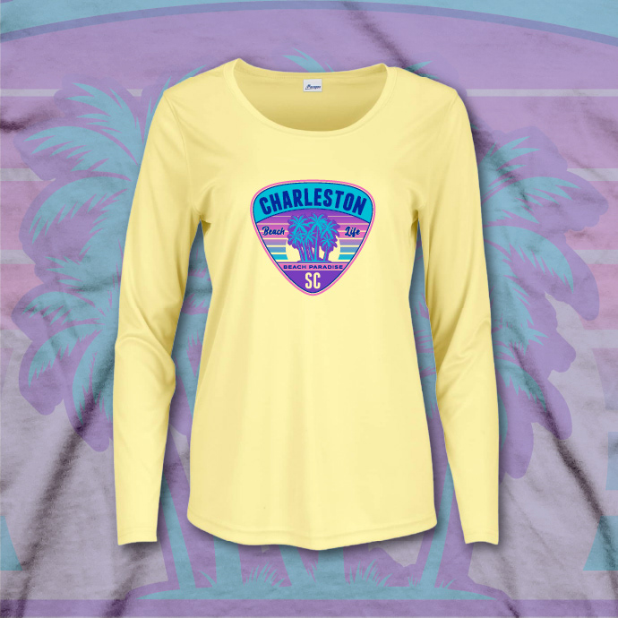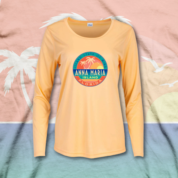 Coastal destination resort apparel collection with name droppable art. The designs are sublimated on lightweight long-sleeve performance tees.