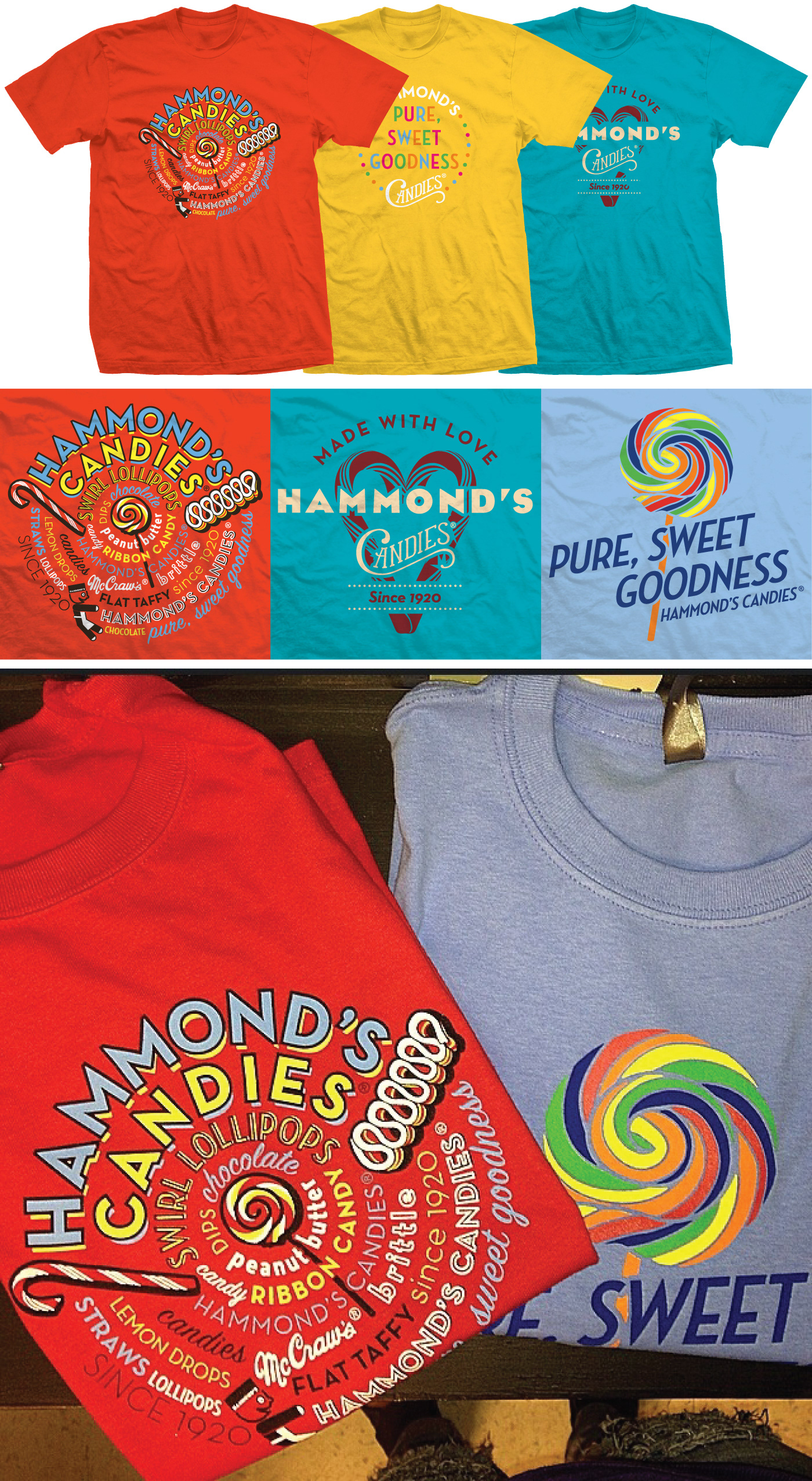 These custom screen printed designs were created in 2014 for Hammond's Candies, a local candy shop based in Denver, Colorado. The colorful art was chosen to fit their branding standards.