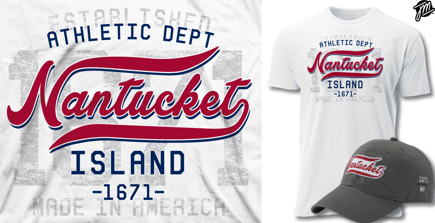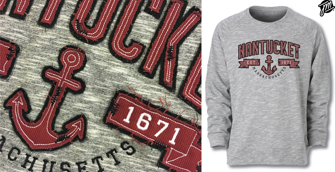 These Vintage Athletic designs were created for Nantucket Island at Ouray Sportswear. The designs include: screen printing with textures, washed twill and embroidery, and some repair stitches to give it a distressed vintage look.